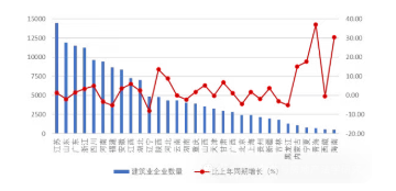 圖 3 2025 年上半年各地區(qū)建筑業(yè)企業(yè)數(shù)量及其增長(zhǎng)情況